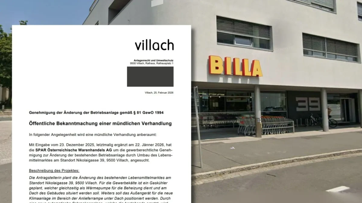 Die Spatzen pfeifen es bereits von den Dächern: Aus der ehemaligen BILLA-Filiale in der Nikolaigasse in Villach könnte demnächst ein SPAR-Supermarkt werden. Der Lebensmittelhändler hat bereits um die gewerberechtliche Genehmigung zur Änderung der bestehenden Betriebsanlage angesucht. Der 5 Minuten Redaktion liegen entsprechende Dokumente vor. Der Standort soll modernisiert und umgebaut werden. Noch hält sich die SPAR Österreichische Warenhandels-AG dazu aber bedeckt, immerhin findet die mündliche Verhandlung erst am Donnerstag, dem 12. März 2026, statt. Auf Nachfrage von 5 Minuten heißt es daher lediglich, dass nähere Details dazu Mitte des Monats bekannt geben werden.